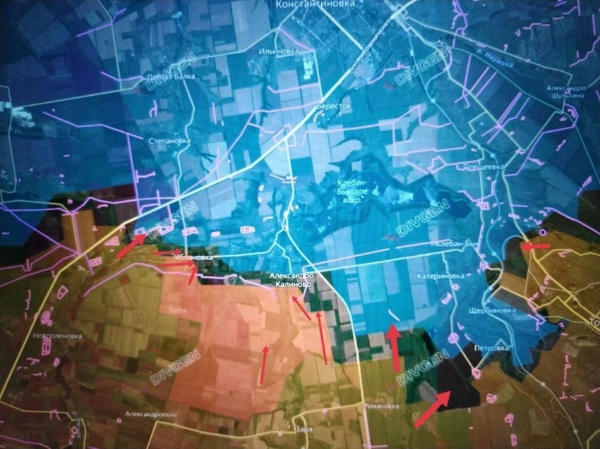 На Константиновском направлении продолжаются боестолкновения севернее Торецка в районе Дылеевки и Дачного. ВС РФ с опорой на Зарю ведут штурмовые действия в направлении Александро-Калиново. Российские войска продвинулись в западной части Яблоневки, давят в направлении центра. Продолжаются встречные бои в районе Попового Яра и южнее Полтавки.