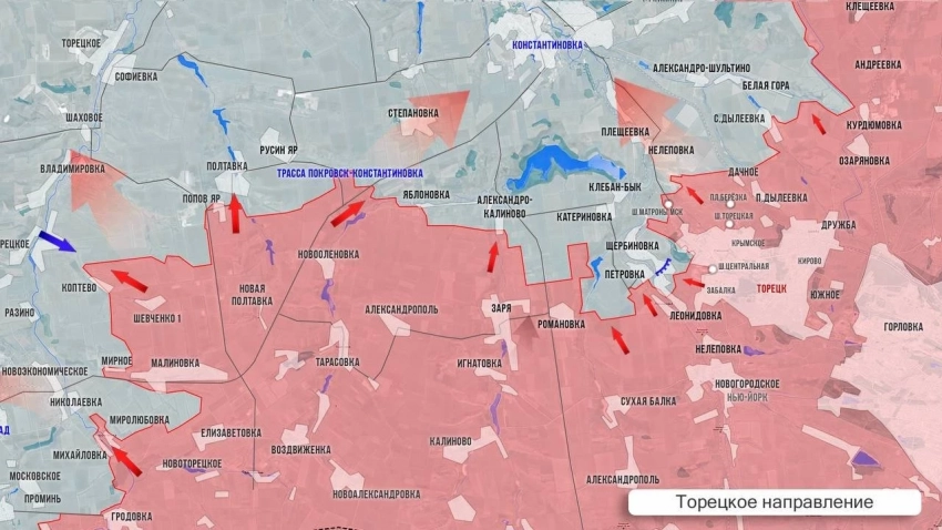 К западу от Торецка ВС РФ постепенно продавливают оборону ВСУ в Яблоновке. От Александро-Калиново наши зачищают территории, расширяя зону контроля. Севернее Торецка бои продолжаются в районе Белой Горы и у Нелеповки.