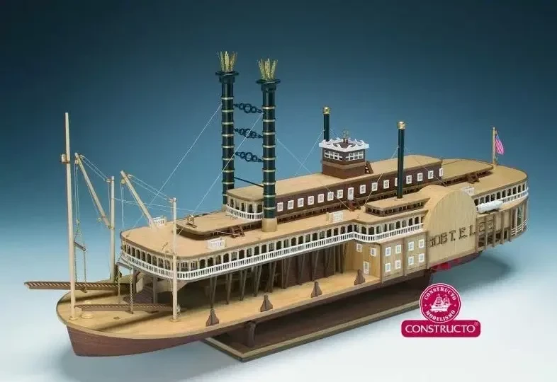 Интересным образом подошли к теме моделирования миссисипских пароходов в отечественной компании «Семейная фотостудия» из Санкт-Петербурга. Они взяли за основу бумажную модель фирмы «ДрафМодел» из их журнала № 1 за 2009 г. и весь силовой набор корпуса и палуб изготовили из тонкого, но прочного картона, методом лазерной резки. То есть эти детали просто выдавливаются из картонных листов, а затем уже на них наклеиваются цветные элементы из бумаги. Хотя, разумеется, большая часть деталей парохода так бумажными (в силу их масштабной толщины!) и осталась. Журнал с цветными развертками плюс лазерная резка стоят 1600 р., что вполне соответствует ожидаемому качеству. Кстати, и бумага, на которой напечатаны детали модели, значительно лучше той, что использовалась поляками в «Малом моделяже» в прежнее время. Масштаб модели 1:100.