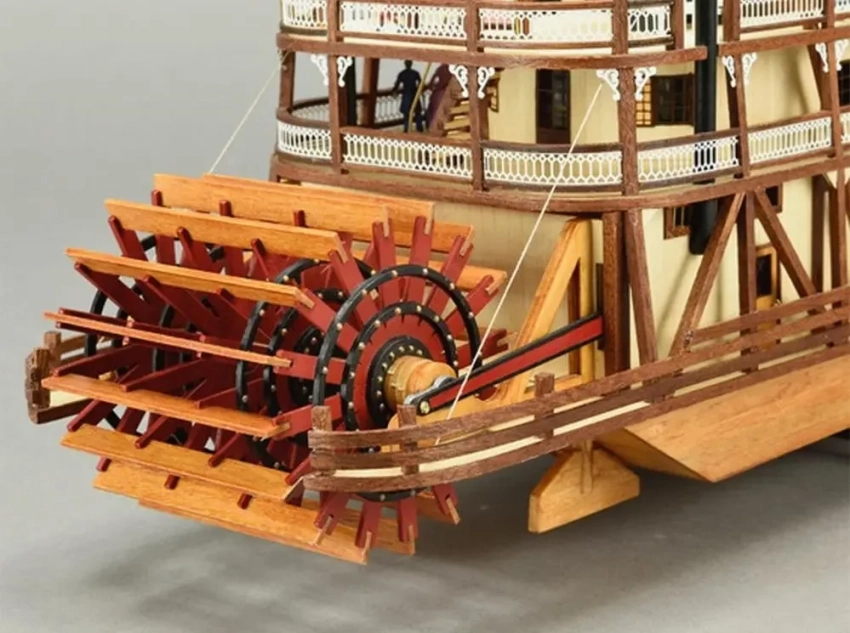 А вот модель испанской фирмы «ОкКре» в масштабе 1:80 и ценой 28 400 р. можно и вовсе моделью не считать, а зачислить в разряд развивающих игрушек. Дело в том, что только эта модель колесного парохода включает в себя аккуратную масштабную мебель для кают и салонов. Имеются стулья, диваны, кровати и даже пианино и игровые столы в салоне. Есть гребные колеса, паровой двигатель, декоративный орнамент труб, резные ограждения, деревянные бочонки, латунные цепи и т. д. Вот только вся мебель для этой модели имеет ярко выраженный «игрушечный вид», чем и портит все впечатление.