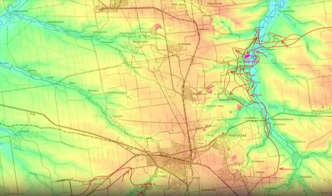 "В Экономическом наши войска продолжают грызть оборону противника, там работают 9-я и 5-я бригады 51-й армии и на сейчас они уже заняли до трети этого населенного пункта, надеюсь скоро мы тоже с ним покончим и таким образом обеспечим левый фланг наступления в тыл Покровской группировки с севера. Ну, а после занятия Маяка наши части попытаются скорее всего выйти на Паньковку, Владимировку и Шахово, чтобы таким образом уже обеспечить правый фланг наступления по обходу Покровска.