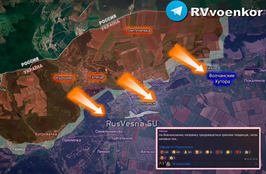 На Купянском направлении идут бои в районе Голубовки и Радьковки. Местные жители сообщают, что ВСУ закрыли Купянск на въезд и выезд блокпостами. Выше по фронту, в районе Тополей, наши чуть продвинулись в направлении Двуреченского.