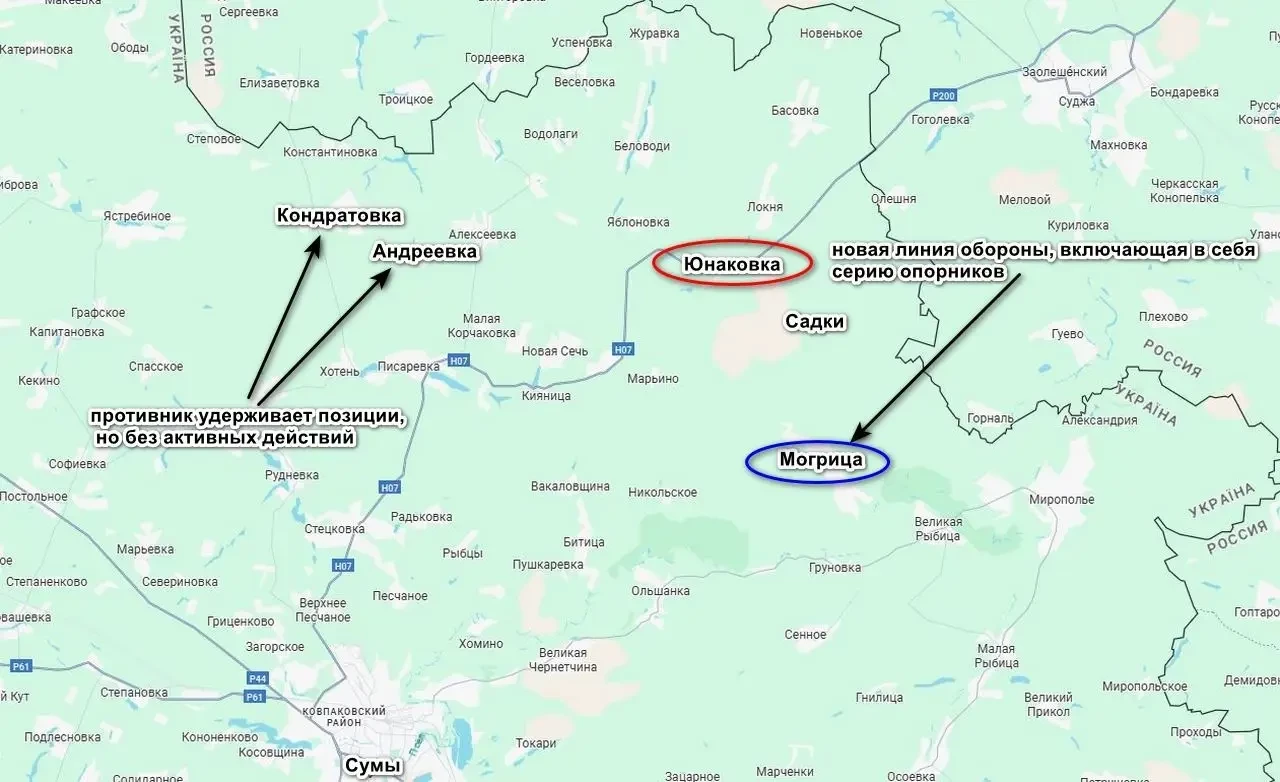 Как подчеркивается, противник пытался до самого конца удерживать часть Юнаковки, несмотря на потери. Та же самая 47-я бригада была переброшена в село с Теткинского направления с задачей не дать российским войскам овладеть населенным пунктом, имеющим для ВСУ важнейшее значение, поскольку закрывало дорогу на Сумы. Сейчас противник отступил с линии Юнаковка — Садки в район села Могрицы, где идет создание новой линии обороны. Также не исключено, что враг будет предпринимать попытки вернуть позиции в Юнаковке.