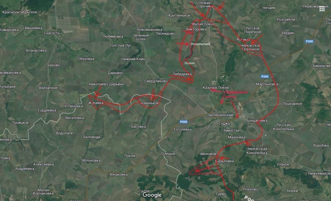 То есть блокада транспортных путей и уничтожение мостов (а как раз три моста, которые были из-за халатности противника нами уничтожены, ведут в т.ч. и в Малую Локню, которая на той стороне от Старых Сорочин) дают результат. По крайней мере на северном выступе Суджанского выступа у противника уже несколько дней отсутствует ротация, подвоз, да и вообще полный швах.