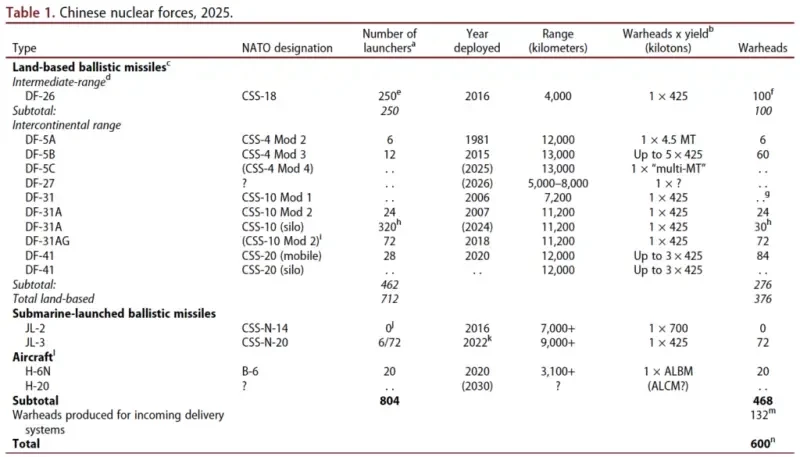 Таблица 1. Ядерные силы Китая, 2025 г.