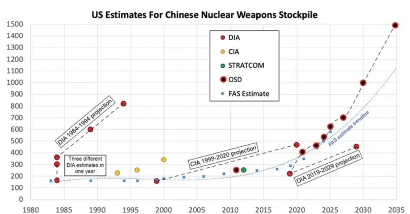 Оценка текущих прогнозов США относительно будущего размера ядерного арсенала Китая должна учитывать более ранние прогнозы, некоторые из которых не сбылись. В 1980-х и 1990-х годах правительственные агентства США опубликовали несколько прогнозов относительно количества китайских ядерных боеголовок.