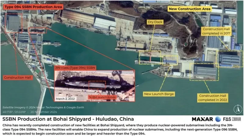 Рисунок 6. Спутниковые снимки, показывающие новое строительство (желтым цветом) на верфи Бохай в Хулудао для потенциального производства ПЛАРБ типа 096.