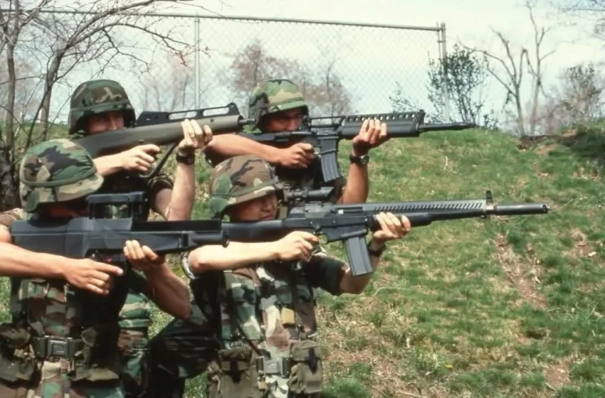 G11 и другие участники испытаний по программе Advanced Combat Rifle. Фото сделано в 1988 году, ещё до начала активной фазы испытаний «отстрелом».