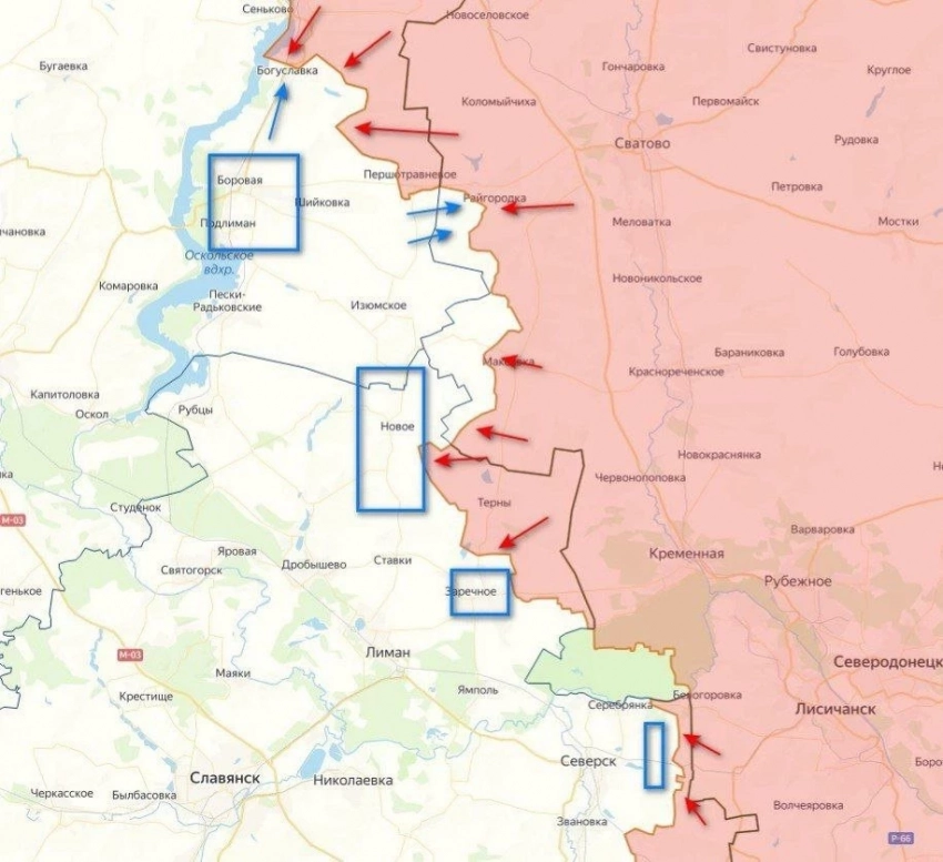 На Краснолиманском направлении наши военные наступают к Новомихайловке, а также западнее Макеевки. Цель - создать единый, протяженный плацдарм вдоль реки. На южном фланге освобождение нашими силами Мирного с последующее наступление на Заречное и Торское позволит ВС РФ выйти к Лиману и обойти Серебрянское лесничество с запада.