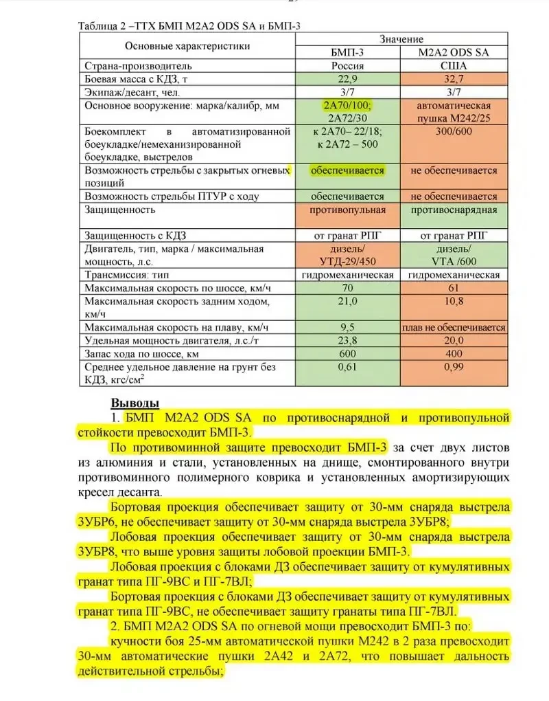 Согласно опубликованным результатам, поставляемые американцами ВСУ БМП Bradley M2A2 ODS SA имеют превосходство над применяемой ВС РФ боевой машиной пехоты БМП-3 по основным параметрам: противоснарядная, противопульная и противоминная стойкость, что достигается конструкцией машины. Противоминная защита БМП Bradley лучше за счет установки на днище двух листов из стали и алюминия, противоминного коврика и амортизирующих кресел десанта. БМП-3 имеет противопульную защиту, тогда как БМП Bradley держит 30-мм снаряды.