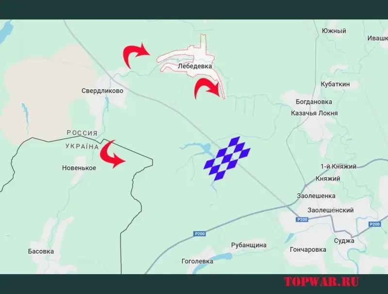 Соответственно выстраивается занимательная конфигурация наших войск – продвижение в сумском приграничье и одновременно в Лебедевке дают возможность осуществлять охват территории вдоль дороги на Суджу с двух направлений. При этом появляется возможность обходить обустроенную в районе пруда линию обороны противника. И далее ВС РФ могут как нанести удары во фланг обороняющемуся противнику на данном участке фронта, так и двигаться дальше – с созданием кольца охвата большего радиуса.