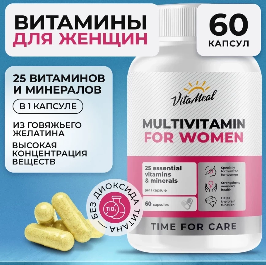 VitaMeal Multivitamin for Women — это один капсульный ответ на 25 женских «нужно». Продукт разработан с акцентом на ключевые витамины и минералы, включая железо, йод, селен и усиленные дозировки витаминов группы B — для поддержки гормонов, иммунитета, бодрости и красоты изнутри. Всё, что нужно, в одной дозе — без танцев с банками и горстями таблеток. Формат «1 капсула в день» делает заботу о себе простой, как глоток воды.