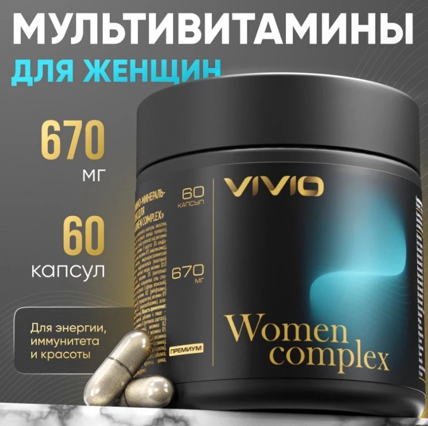 Витамины Women Complex от VIVIO — это универсальный мультикомплекс, который уверенно входит в рейтинг БАДов для женщин после 50. Он создан для тех, кто хочет не просто поддерживать здоровье, а ощущать себя энергичной, ухоженной и собранной каждый день. 21 активный компонент в составе работает синергично: от коллагеновой поддержки кожи до стабильной работы нервной и репродуктивной систем. Укрепление иммунитета, сияющая кожа, прочные ногти, спокойствие и сила — всё в одной капсуле. Отличный выбор для женщин, знающих, чего хотят от БАДов.