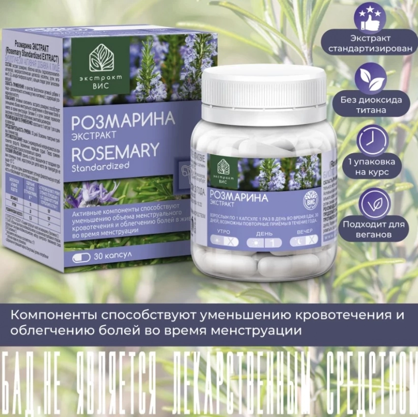 Розмарина Экстракт от ВИС — это умная и деликатная поддержка женского организма в самый чувствительный период месяца. Сертифицированный экстракт розмарина с высокой концентрацией розмариновой кислоты действует как природный спазмолитик и антиоксидант: расслабляет гладкую мускулатуру, снижает воспаление и помогает уменьшить менструальные боли. Витамин Е и рутин усиливают эффект, смягчая симптомы дисменореи и защищая клетки от окислительного стресса. Работает мягко, но уверенно — именно так, как нужно.