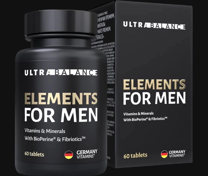Elements for Men Premium от UltraBalance — это не просто мультивитамины, а комплексный мужской спортпит нового поколения. Формула усилена запатентованными BioPerine и Fibriotics, которые ускоряют усвоение витаминов и заботятся о пищеварении. В составе — весь нужный спектр нутриентов, включая витамины A, D3, B-группу, цинк, магний и ферментированную смесь из 36 суперфудов. Это достойный кандидат в список топ БАДов для спортсменов — для тех, кто работает на износ, но хочет сохранить здоровье, выносливость и ясную голову.