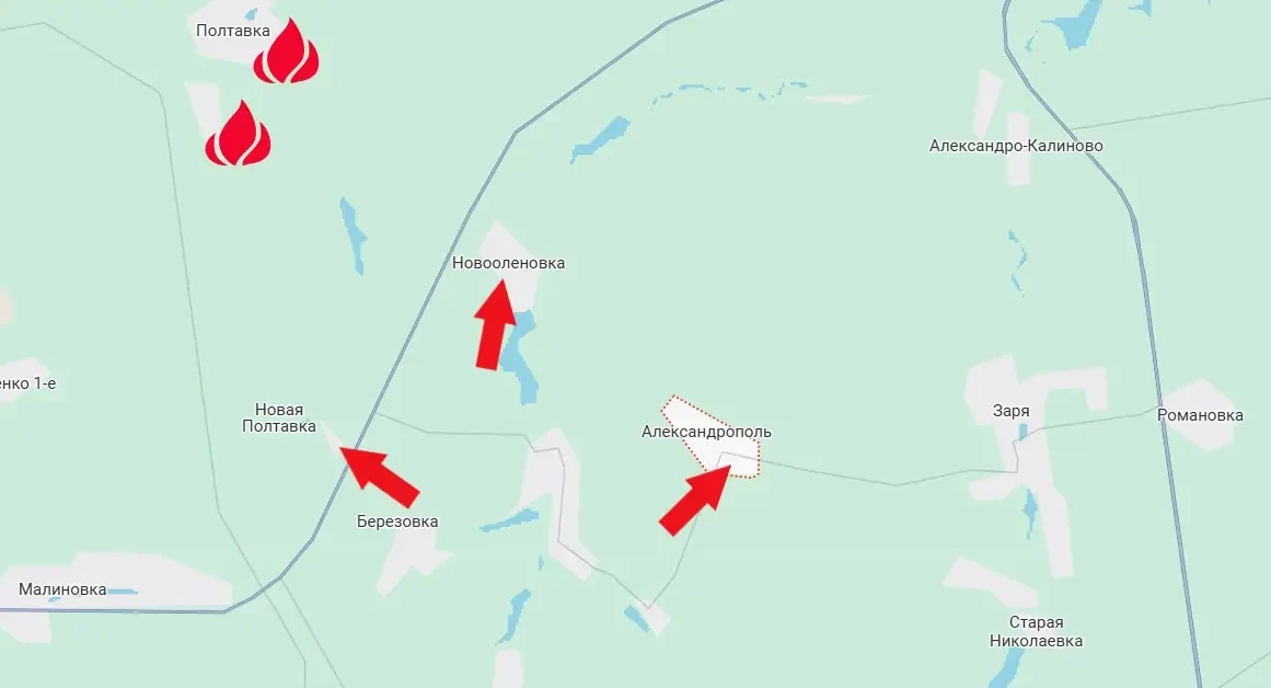 К настоящему моменту противник под ударами ВС РФ потерял контроль над позициями на южной окраине Александрополя. Таким образом российские подразделения увеличивают зону контроля в географическом треугольнике Новоеленовка – Александрополь - Новая Полтавка.