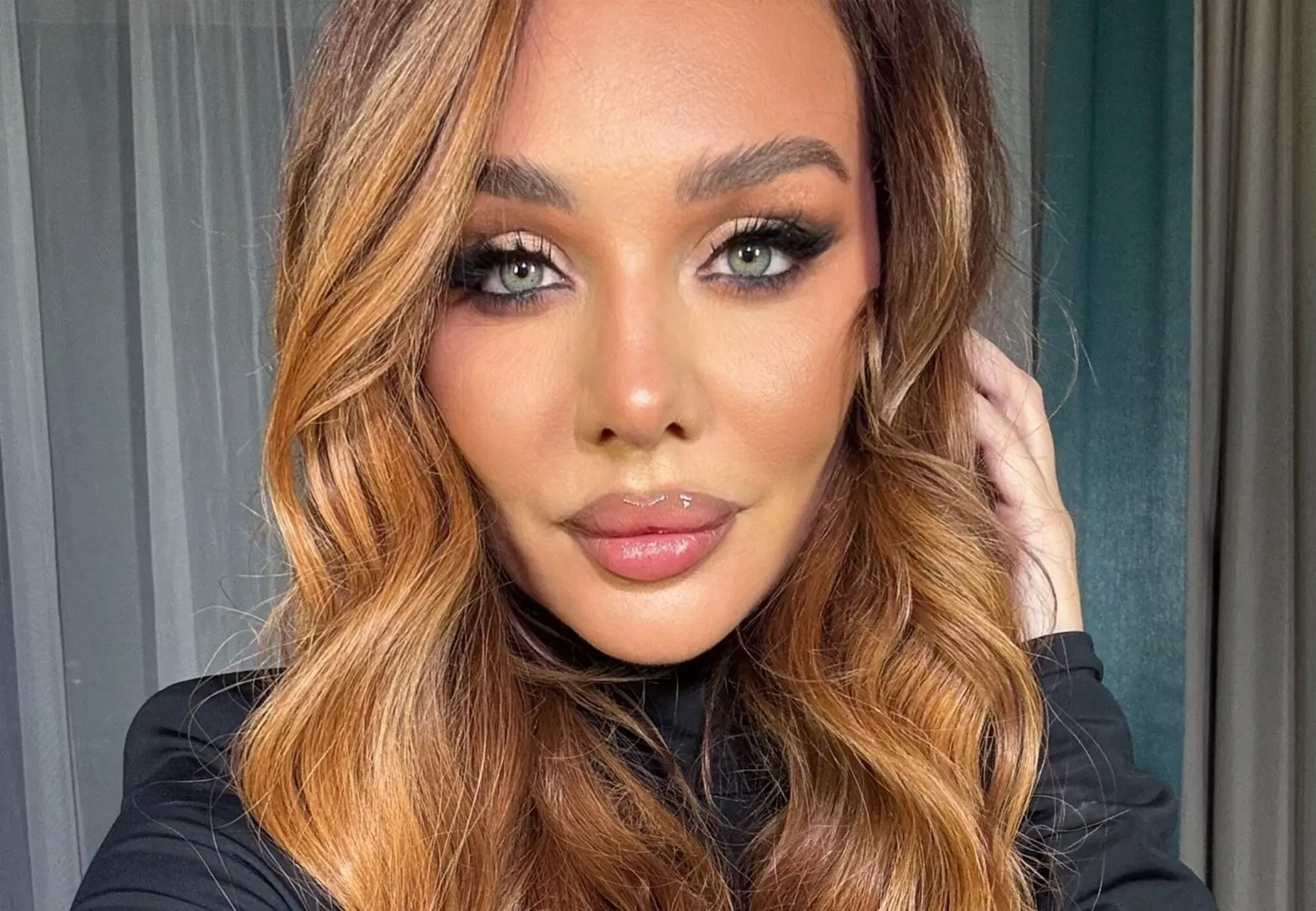На снимках певица позирует в чёрном джемпере с высоким воротом, дополнив образ ярким макияжем и причёской с кудрями.