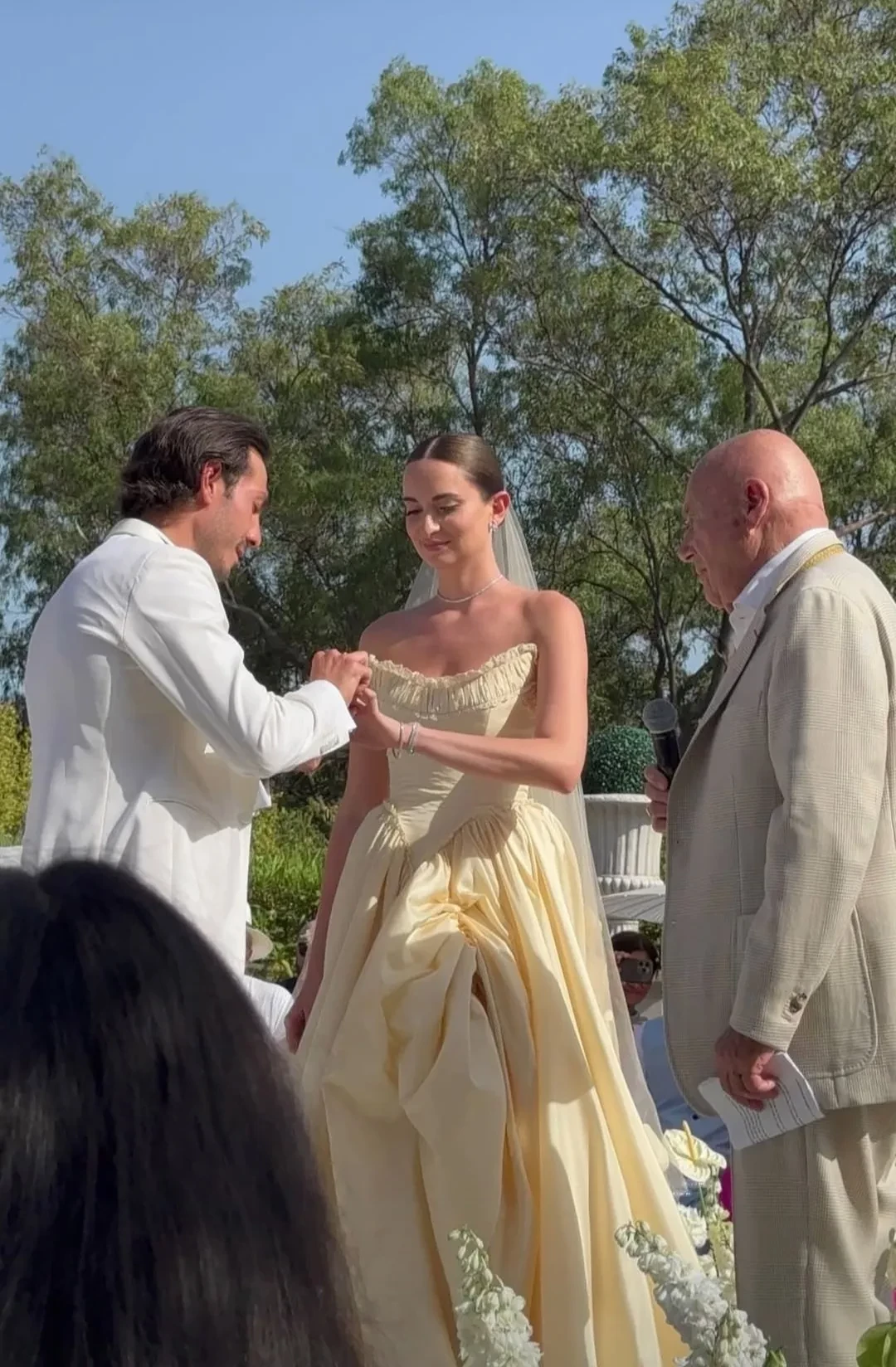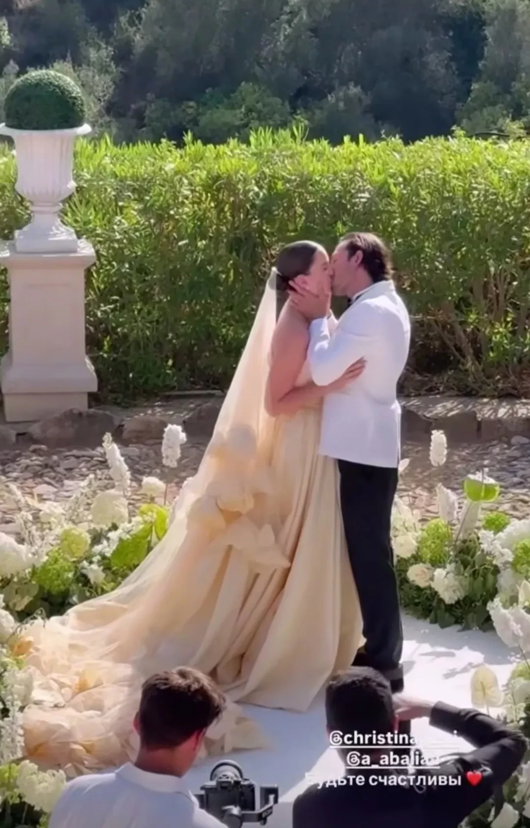 Кристина Левиева и Артур АбалянСтарший коллега Кристины, Владимир Познер, выступил в роли распорядителя клятв. Он спросил у жениха и невесты на английском языке, готовы ли они сочетаться браком, и, когда те ответили согласием, предложим им обменяться кольцами.