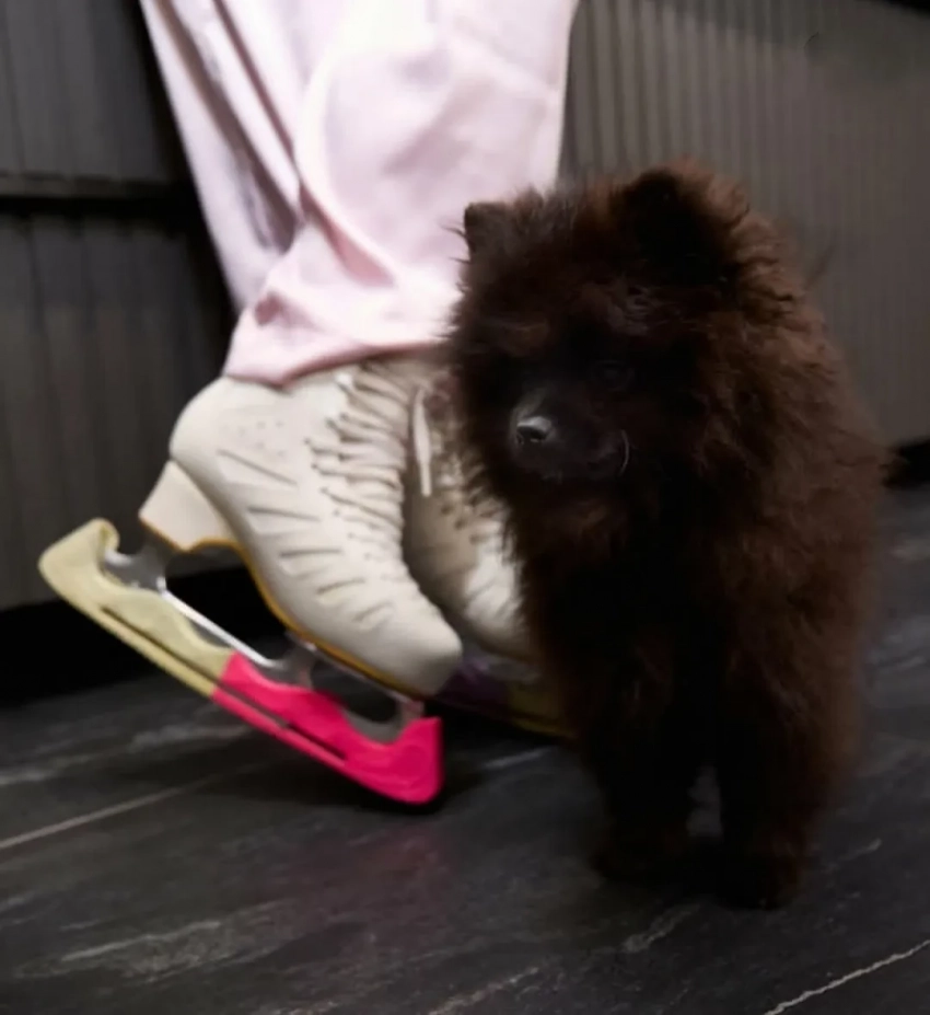 На снимках фигуристка предстала в розовых штанах и рубашке, не скрывающих округлившийся живот. И хотя съёмка проходила не на льду, на ногах спортсменки были коньки. А довершал композицию один из домашних питомцев Трусовой.