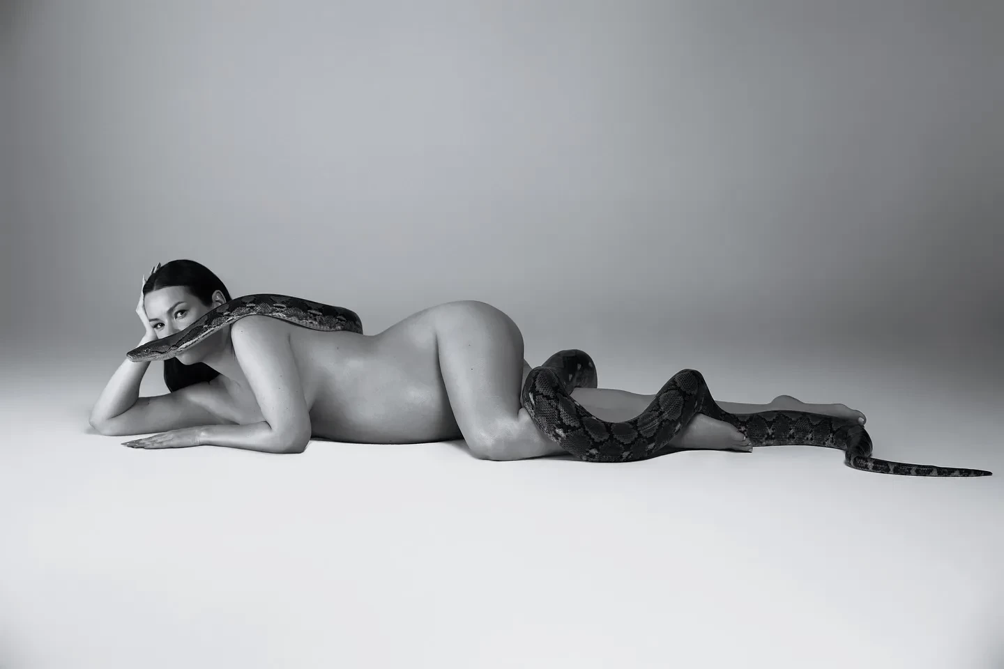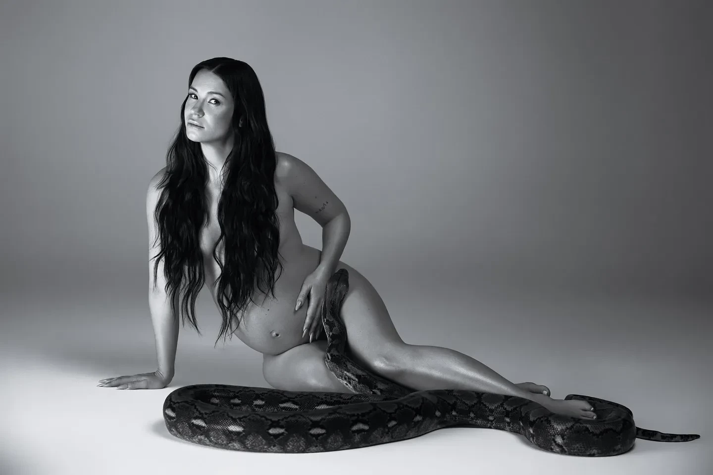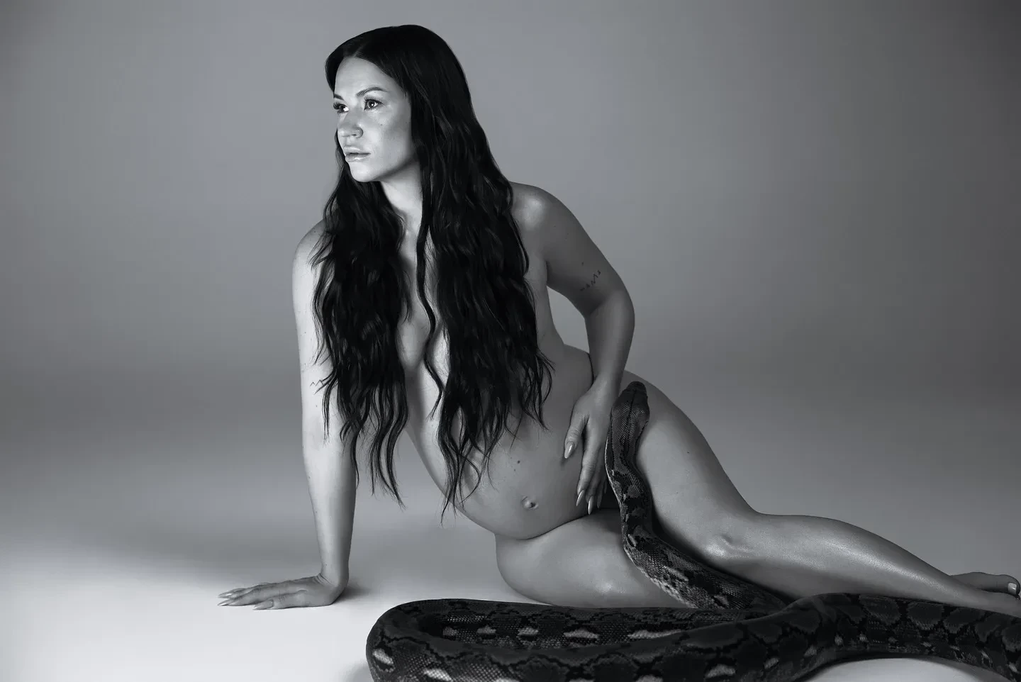 35-летняя Ида Галич, которая ждёт второго ребёнка, снялась в новой фотосессии. На чёрно-белых кадрах, которыми блогерша поделилась в инстаграме*, она позирует полностью обнажённой, а на её теле извивается питон.