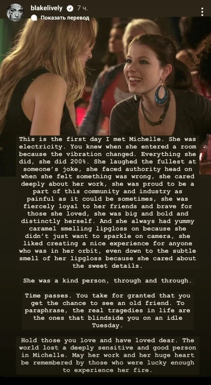 Пост Блейк Лайвли/Фото: скриншот/blakelively/Instagram*Мишель Трахтенберг начала карьеру в возрасте трёх лет, появившись в шоу "Приключения Пита и Пита" на канале Nickelodeon. Её первой большой работой в кино стала роль ребёнка-сыщика в фильме "Шпионка Гарриет" (1996). В 2000 году актриса прошла кастинг в телесериал "Баффи — истребительница вампиров" на роль сестры Баффи Саммерс. Она также сыграла в комедийном фильме "Евротур" и Джорджину Спаркс в сериале "Сплетница". Встречалась с агентом по поиску талантов Джеем Коэном. Ранее в сети обсуждали изменившуюся внешность Мишель: говорили, что она могла прибегнуть к пластический операции или использовать препарат для похудения "Оземпик". Однако сама она опровергала эти слухи.