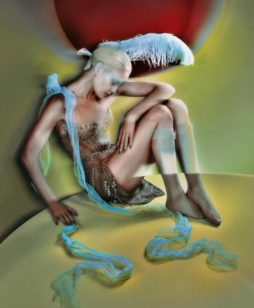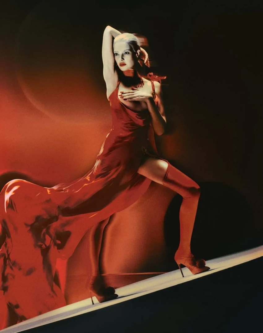 На снимках Наталья предстает в образах, навеянных атмосферой кабаре и ретро-цирка. В объективе Елизаветы Породиной модель позирует в платьях, созданных с использованием ручной вязки и бисера, в атласном кутюрном макси и в мини, напоминающем кольчугу, с жемчужными бусинами. Но главным украшением коллекции стала алая цветочная накидка из сетки, украшенная шифоновыми соцветиями и полностью расшитая жемчугом и кристаллами.
