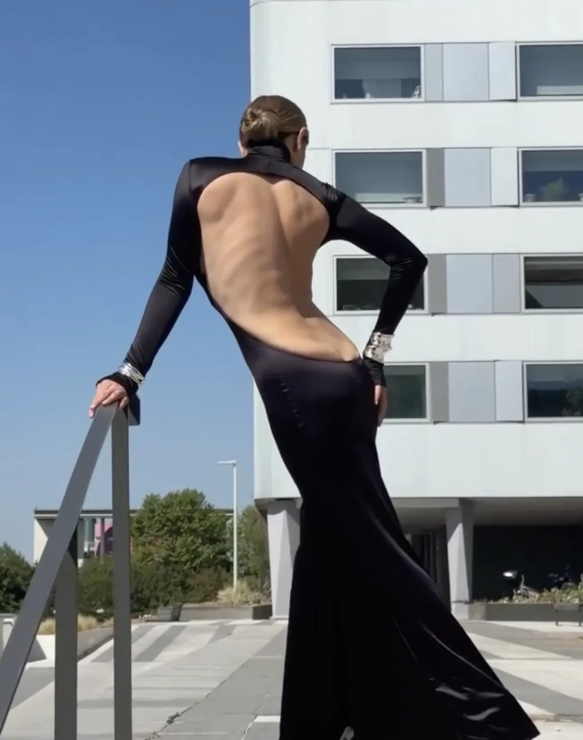 Вера БрежневаВпервые платье с "задним декольте" публика увидела на героине Мирей Дарк в фильме "Высокий блондин в чёрном ботинке", вышедшем в 1972 году, хотя двумя годами ранее Ив Сен-Лоран создал идентичное платье, глубокий вырез на спине которого прикрывало только чёрное кружево. С тех пор многие дизайнеры повторяли модный приём с частичным оголением ягодиц.