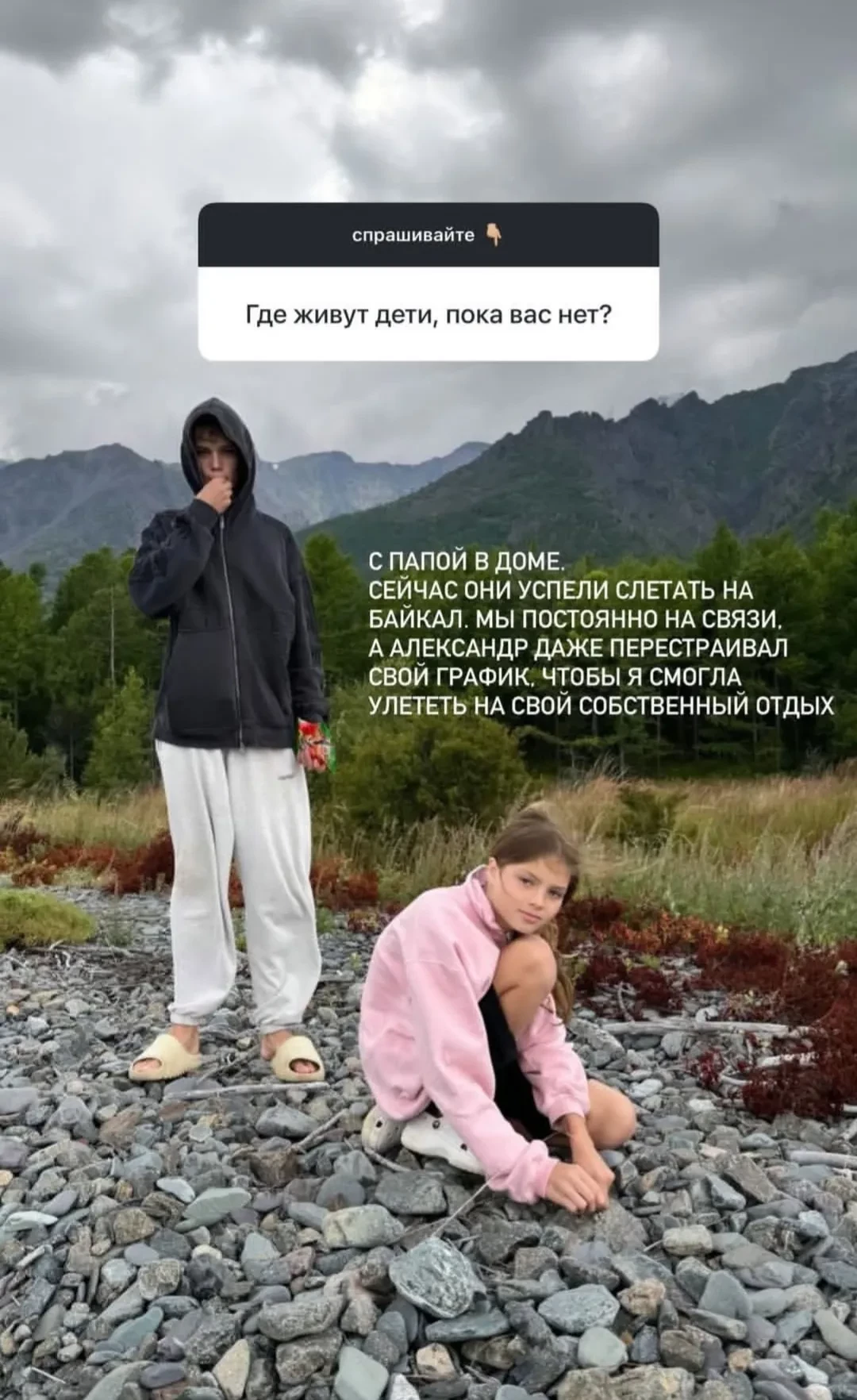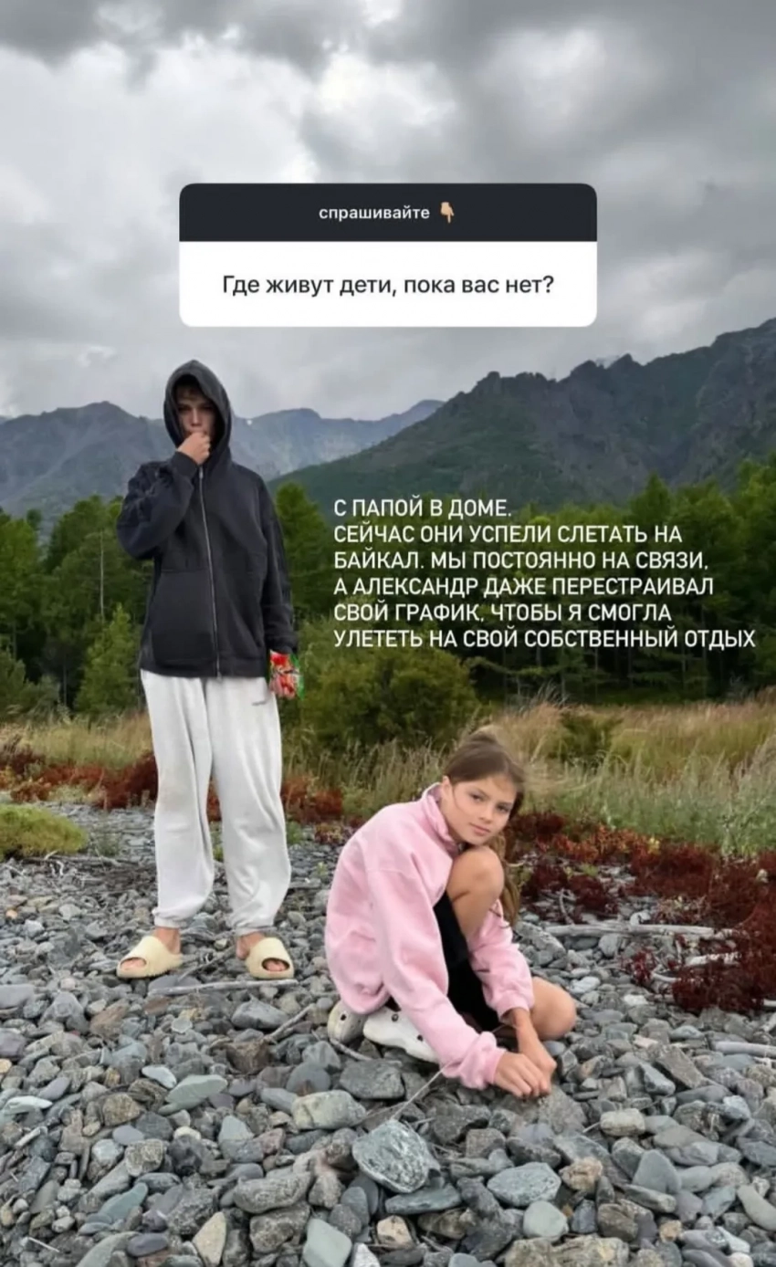 Елена Перминова с детьмиПо её словам, ей не приходится беспокоиться о детях, ведь когда она не может находиться с ними, они живут с 65-летним отцом, который отлично о них заботится: “Сейчас они успели слетать на Байкал. Мы постоянно на связи. А Александр даже перестраивал свой график, чтобы я смогла улететь на свой собственный отдых”.
