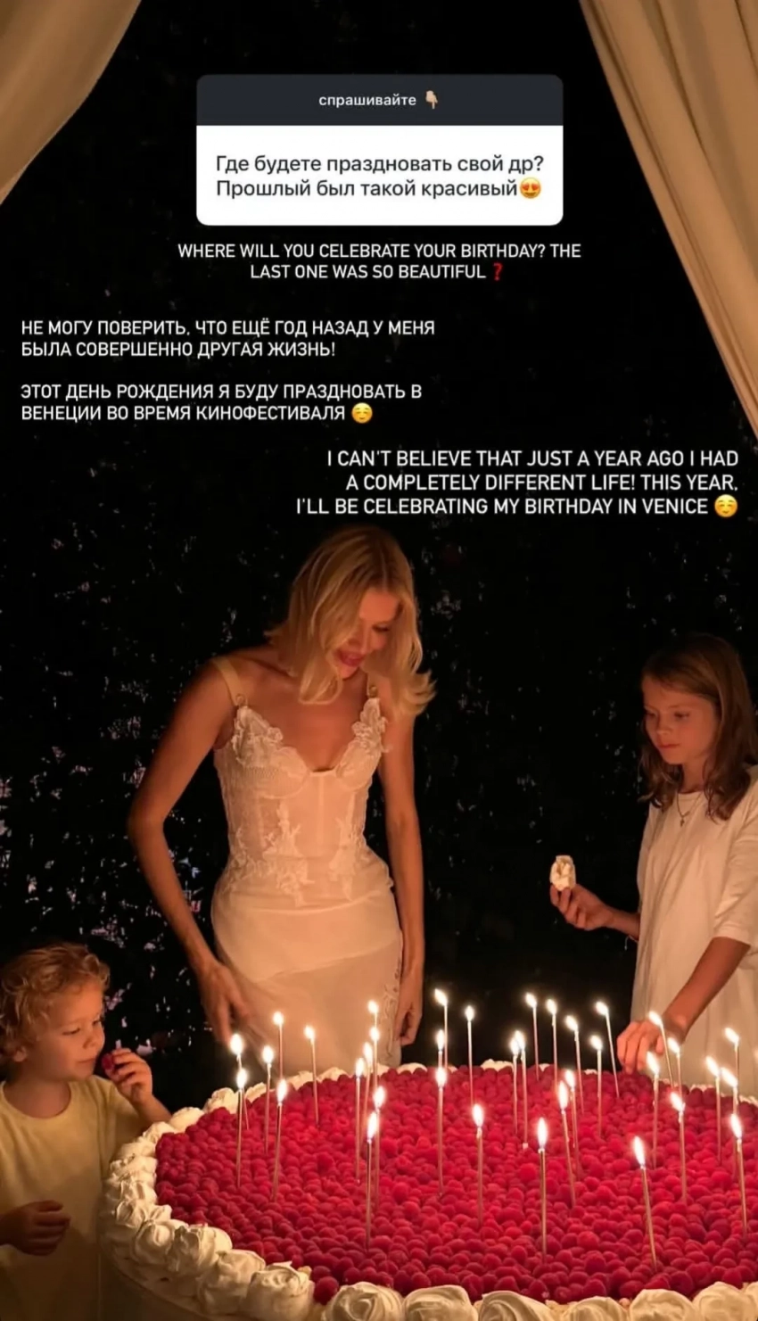 В сторис* Елена призналась, что ей не верится, что “ещё год назад у неё была совершенно другая жизнь”. Например, свой прошлый день рождения она отмечала вместе с детьми и их отцом, а в этот раз хочет отправиться в Венецию, чтобы приурочить празднование к проходящему там кинофестивалю.
