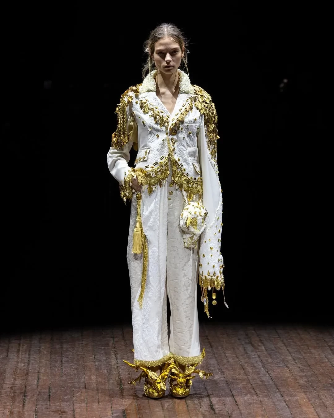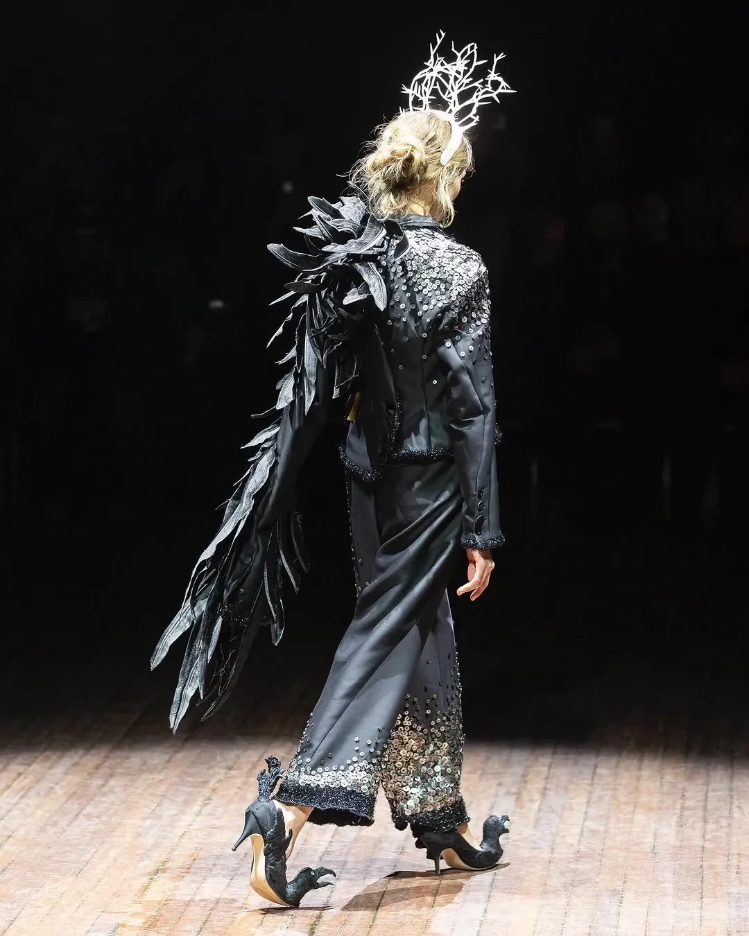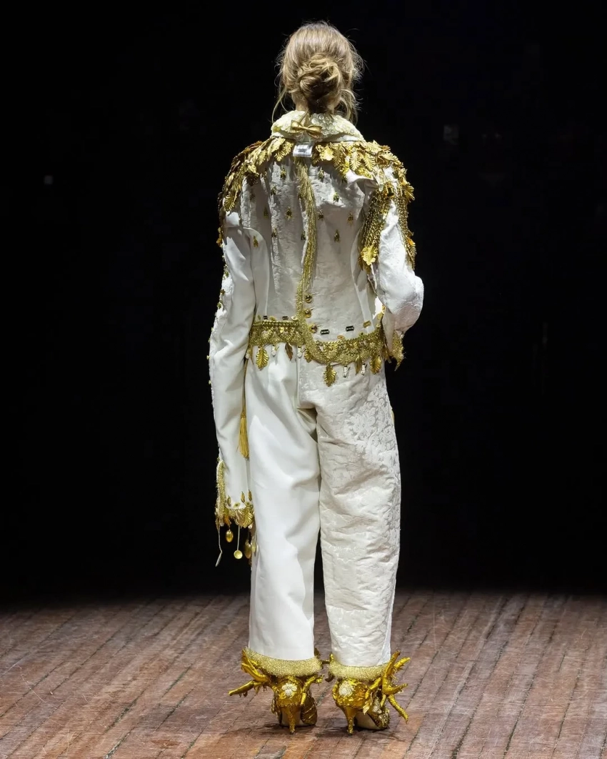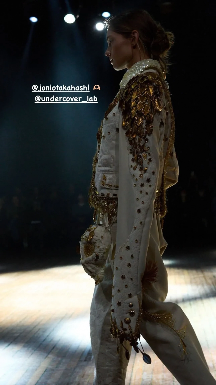 В Париже в рамках Недели моды состоялся показ осенней коллекции бренда Undercover. Шоу открыла и закрыла Алеся Кафельникова. 26-летняя российская модель прошлась по подиуму в белом костюме, расшитом золотом, а в финале вышла в чёрном комплекте с перьями.