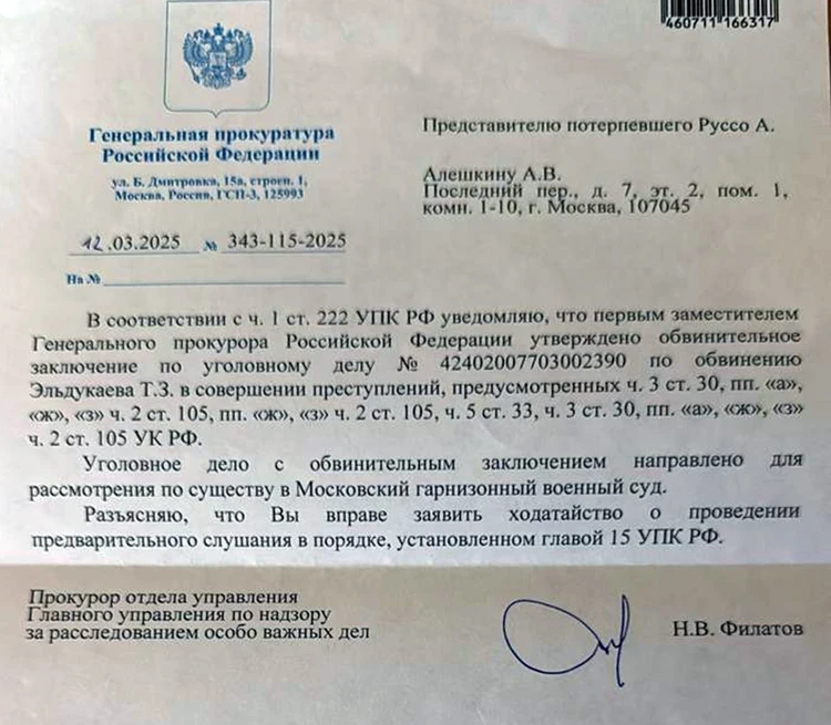 Теперь Руссо вместе с адвокатом Андреем Алешкиным пытается взыскать моральный ущерб с вероятного похитителя — борца Тархана Эльдукаева. В начале 2025 года был подан иск в отношении спортсмена. И 28 марта стало известно, что дело передано для рассмотрения в Московский гарнизонный военный суд (что может говорить о том, что ответчик проходит службу в российской армии). Генпрокуратура утвердила обвинение по нескольким частям ст. 105 УК РФ.