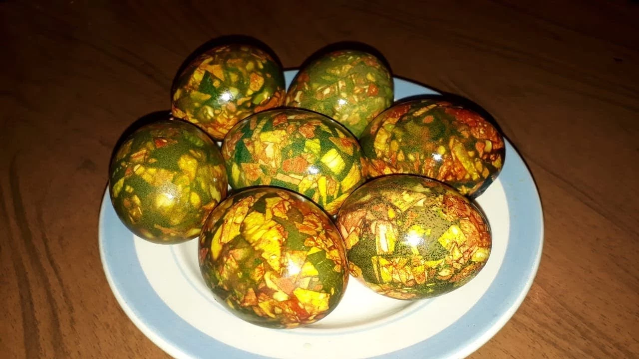Второй способ позволяет создать не только зеленые яйца, но и добавить на них красивые красные мозаичные узоры. В этом методе дополнительно используются луковая шелуха и бумага, что придает крашенкам необычную текстуру.