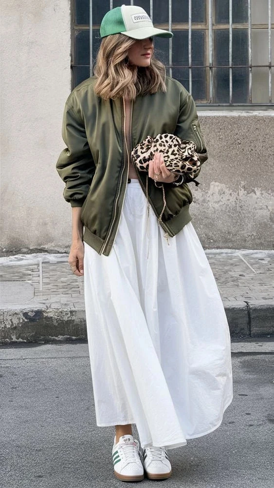 Бомбер и платье — контраст, который сейчас на пике популярности. Попробуй шелковое платье-комбинацию с кожаным бомбером и грубыми ботинками — смело и стильно. Добавь минималистичные серебряные украшения — и образ готов для вечеринки или свидания.