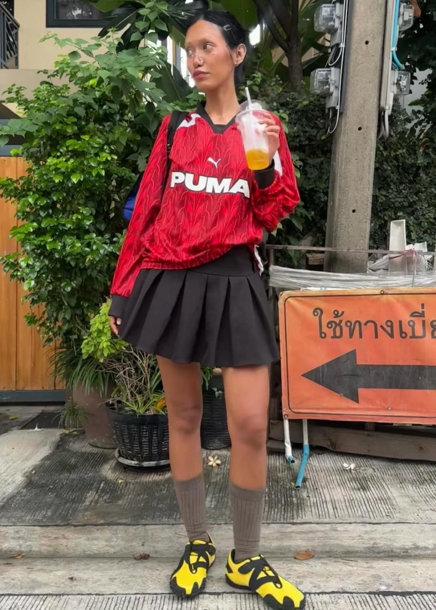 Баланс между женственностью и дерзостью — массивные сникеры с трековой подошвой теперь на пике. Вдохновением стали модели от Balenciaga, Prada и Miu Miu: тяжелая форма, скульптурный протектор и нарочитая грубость делают эти кроссовки центральным элементом образа.