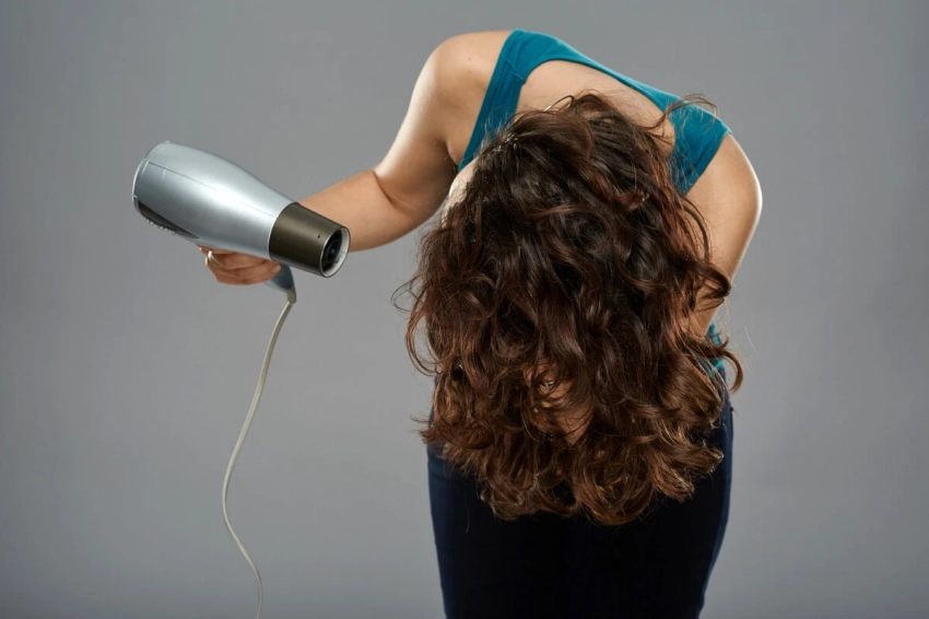 Наклони голову вперед и суши волосы феном от корней к кончикам, помогая пальцами или расческой.